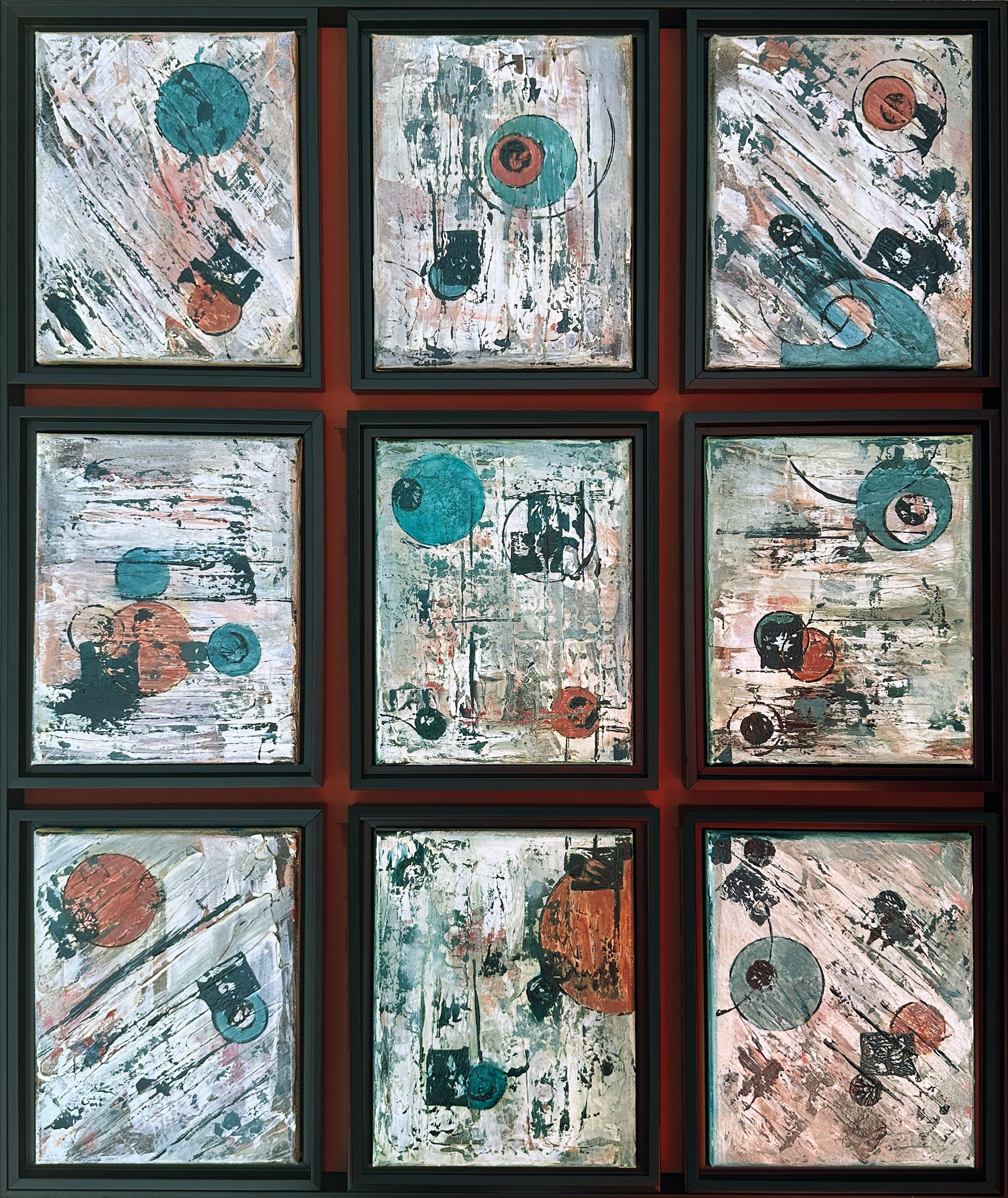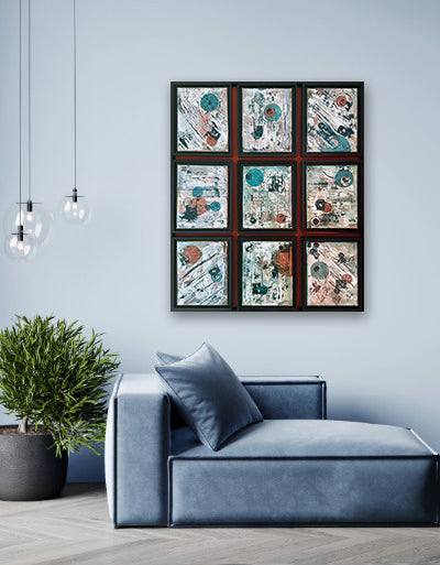 Off The Grid is a striking 9-panel polyptych that transforms your space into a gallery-worthy statement. Each mixed media, oil on canvas, abstract panel is individually mounted and framed in sleek black, then unified into one expansive composition. The warm rust background creates depth and visual intrigue, allowing the abstract elements to dance across the entire installation. Perfect for collectors seeking a bold, contemporary focal point that commands attention while maintaining sophisticated restraint.
